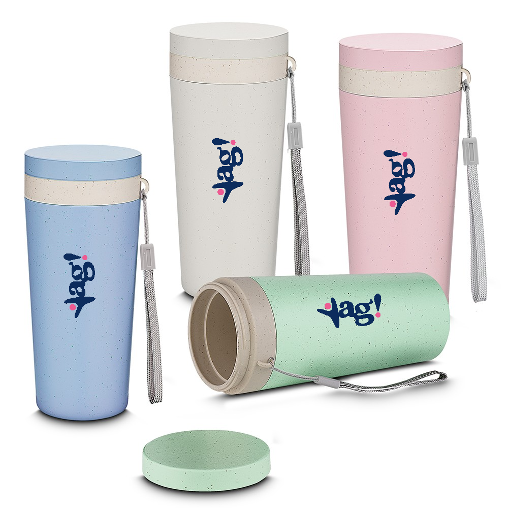 Copo plástico com parede dupla, produzido com fibra de trigo e plástico, com capacidade de 300ml, alça para transporte e tampa rosqueável.