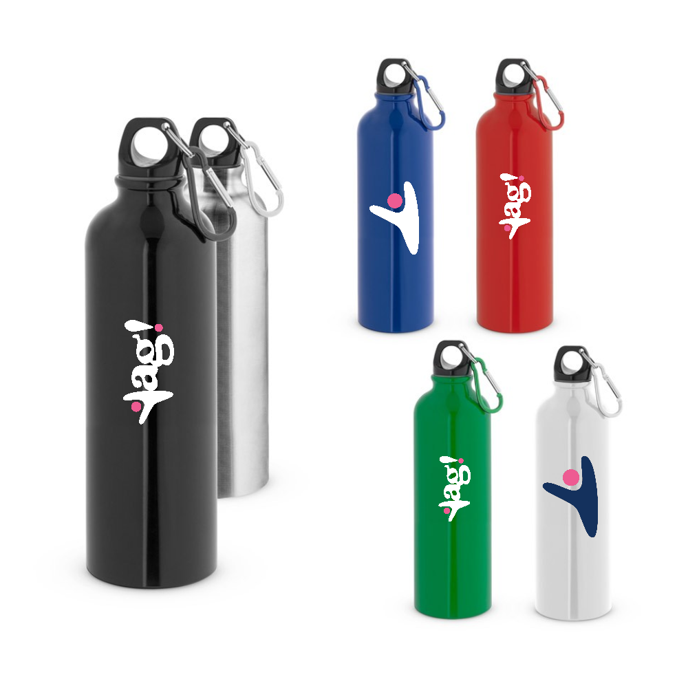 Squeeze esportiva em aço inox de parede simples. A tampa tem um mosquetão que facilita seu transporte ou pode ser pendurado numa mochila. Capacidade até 790 mL. Certificação EU Food Grade. Ø72 x 252 mm