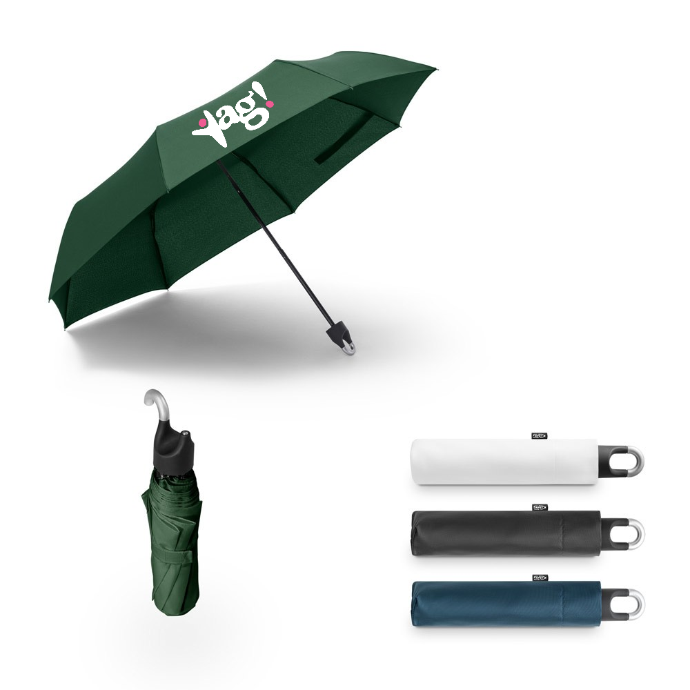 Guarda-chuva de 21” em poliéster 100% reciclado pongee 190T, com varetas em fibra de vidro, haste metálica e pega em ABS reciclado. O guarda-chuva, dobrável em 3 seções, tem abertura manual e é à prova de vento. Fornecido numa bolsa individual. ø980 x 280 mm | Bolsa: ø50 x 230 mm