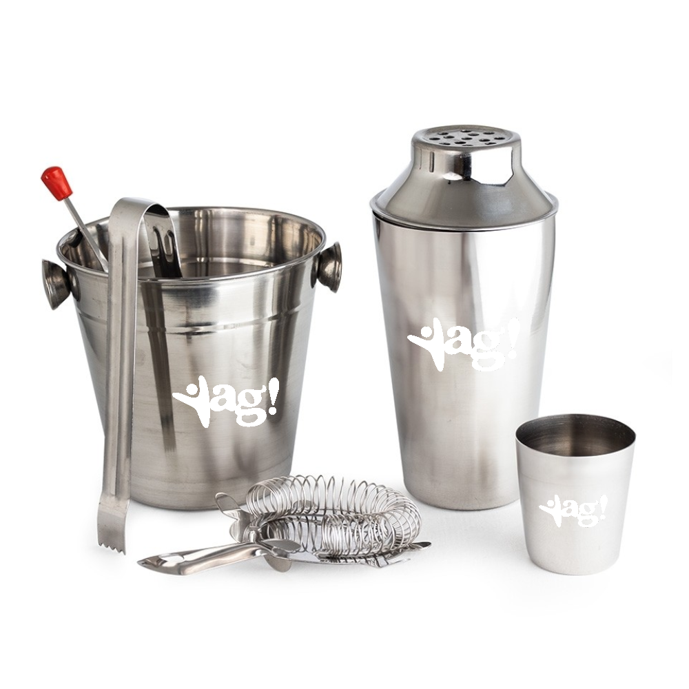 Kit bar, com utensílios essenciais em inox. Ccoqueteleira de 500ml com peneira na tampa, coador para separar o gelo, colher bailarina ideal para misturar bebidas em copos jarras e mixing glasses, além de pegador e balde de gelo.