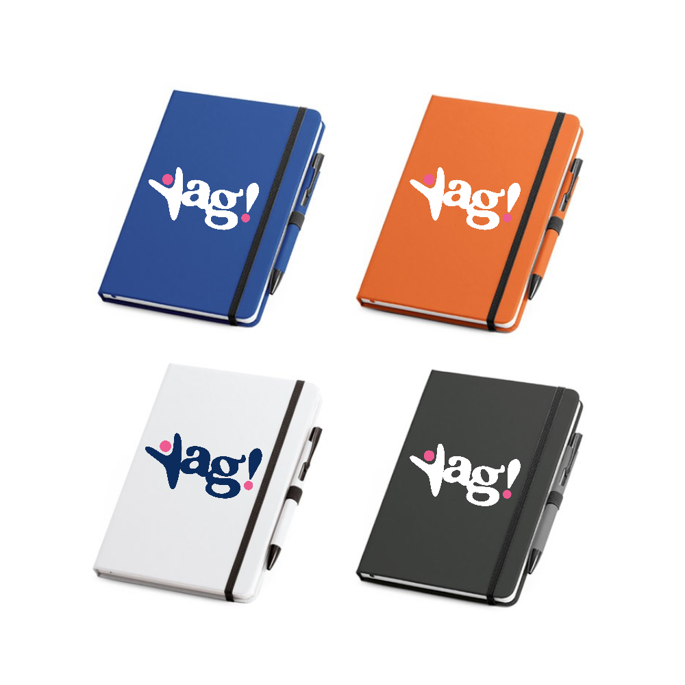 Conjunto de caderno A5 e esferográfica. O caderno de capa dura em c. sintético contém 160 páginas lisas, fita separadora e elástico para fecho do bloco. A esferográfica tem escrita em azul. Fornecido com caixa presente em PP com elástico.